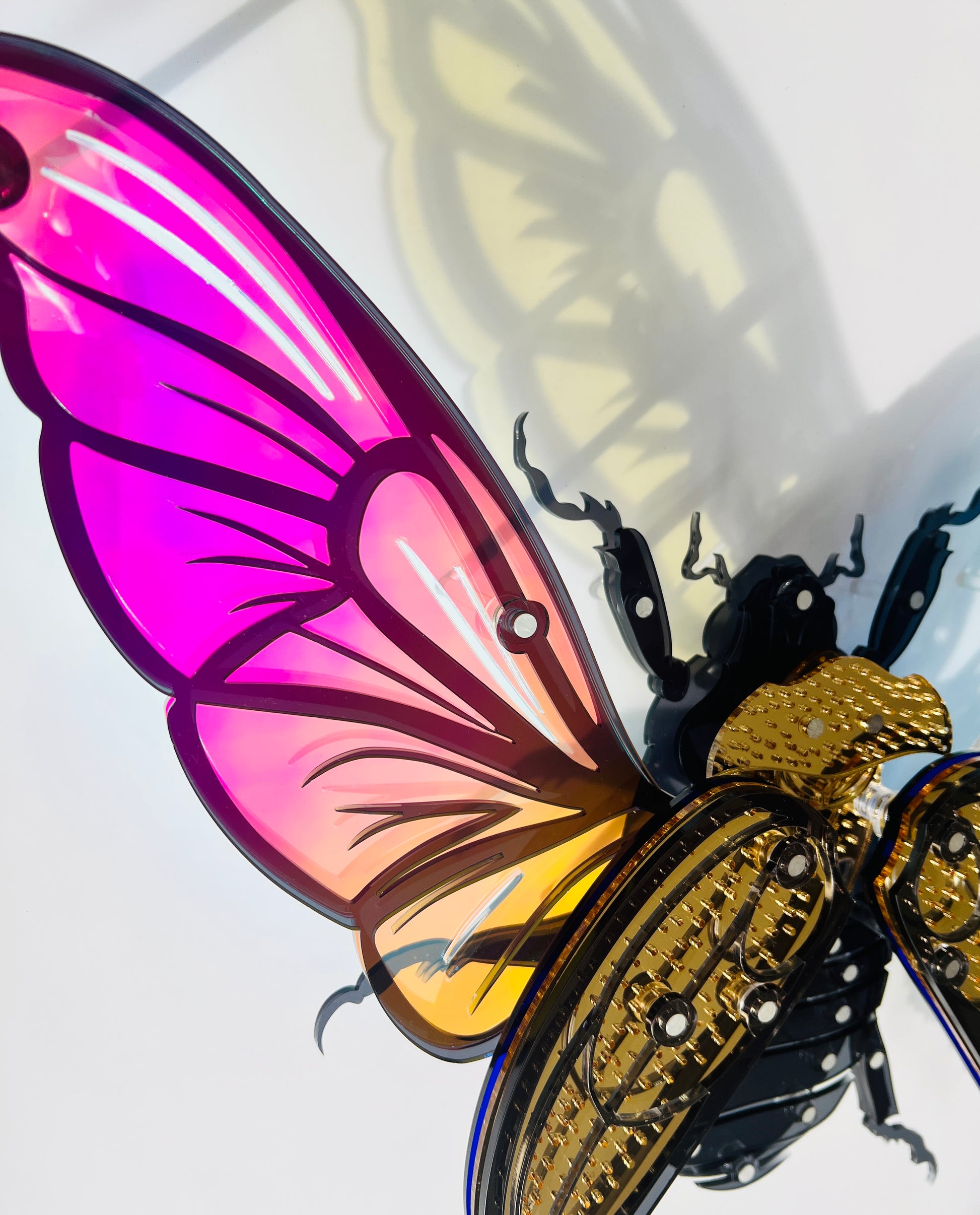 Golden Scarab Beetle – a bold and beautiful piece from our Aurora Collection. Inspired by the ancient scarab beetle and reimagined with a modern twist, this 3D wall art is crafted from layers of tinted acrylic (Perspex), delicately suspended on clear rods to create a stunning lifelike effect that appears to float from the wall.
