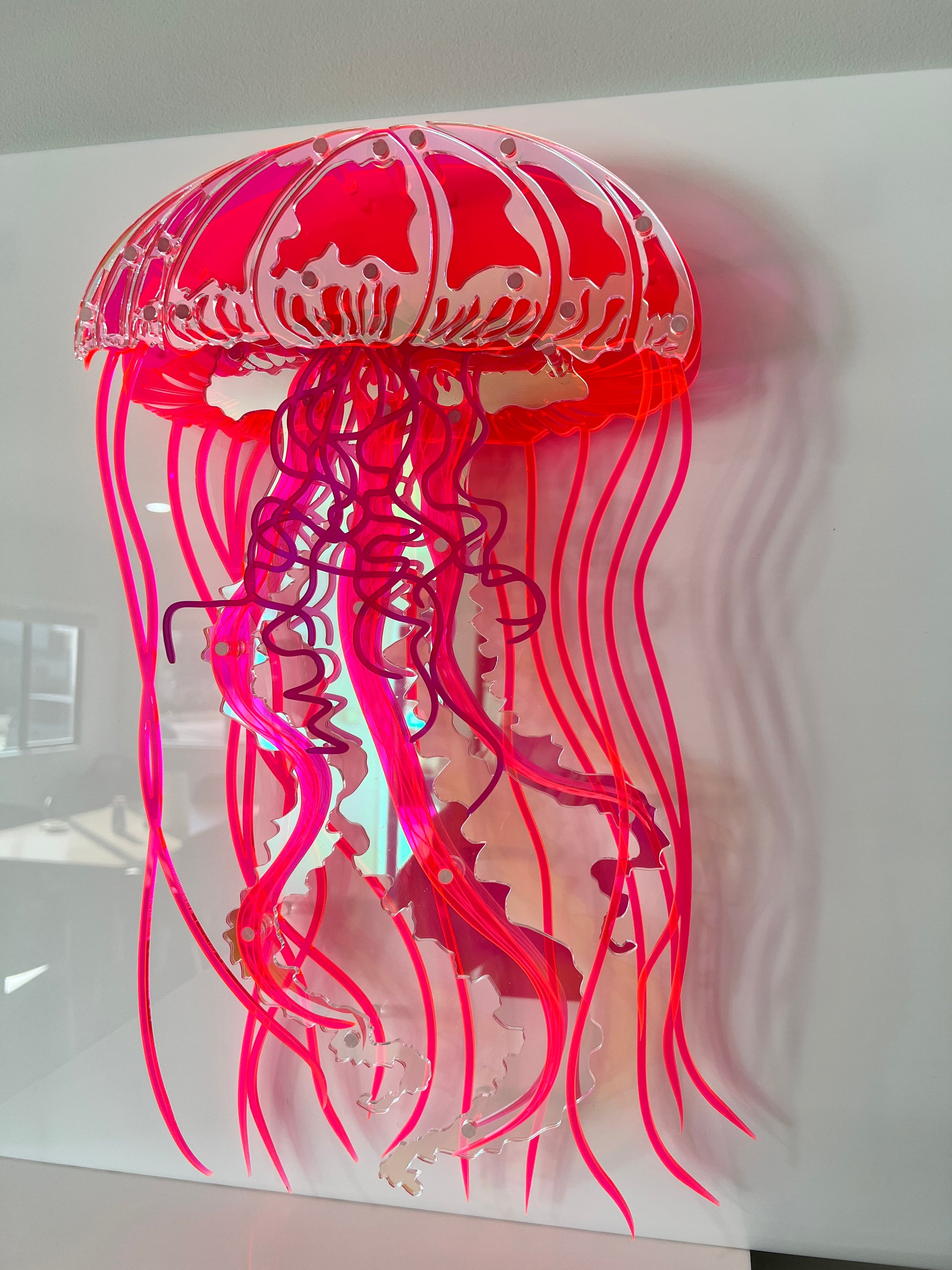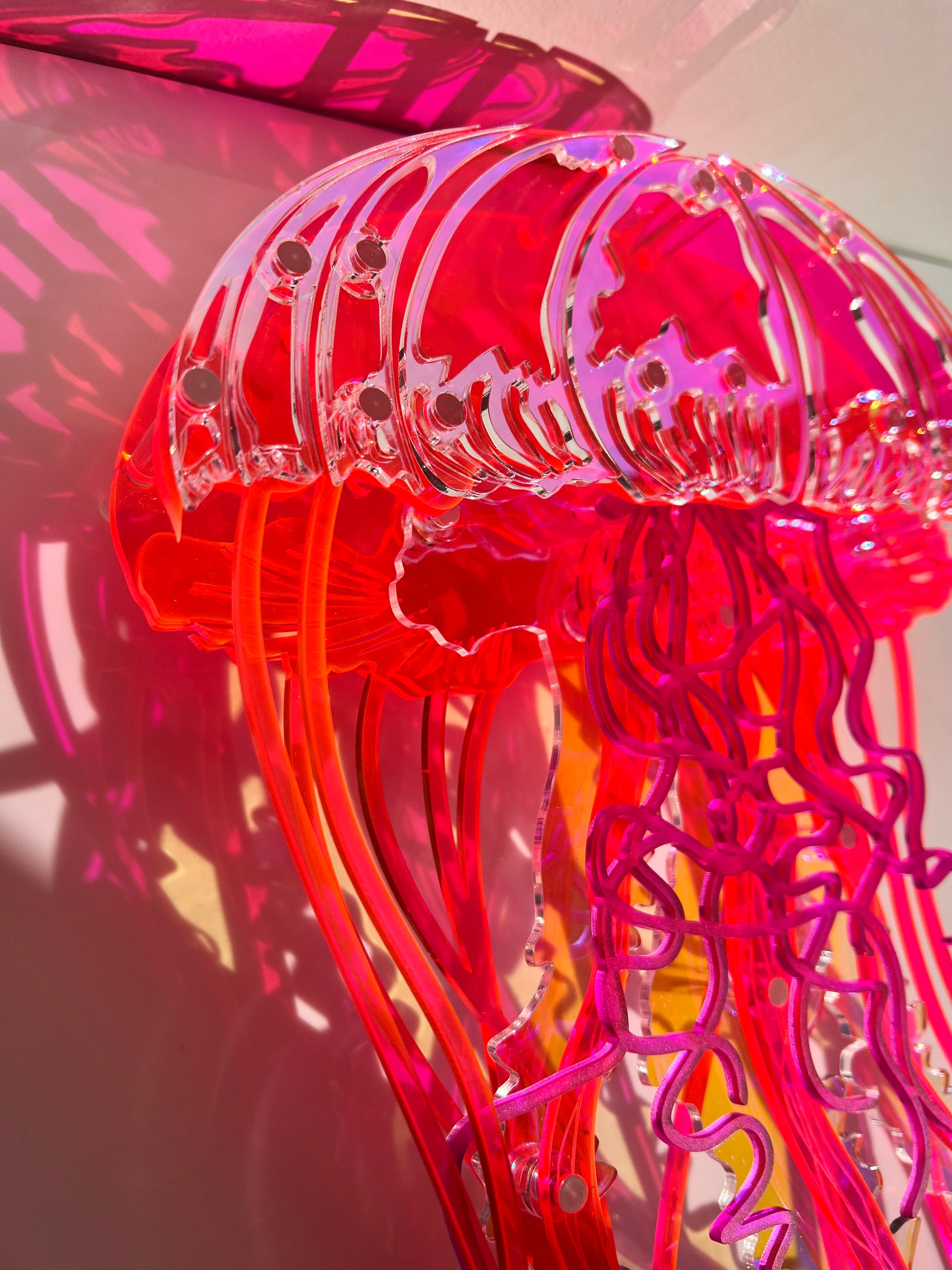 The vibrant Neon Jellyfish – a striking piece from the Aurora Collection that blends the movement of this ocean creature with sculptural design, casting soft shadows and catching light from every angle.